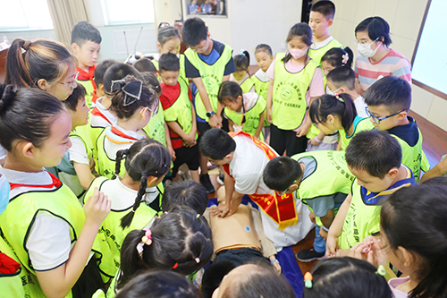 急救知识讲师医务科王立新为孩子们带来急救知识讲座,并针对心肺复苏、海姆立克急救法的具体操作进行现场演练,多名学生代表在医生的指导下完成了标准的心肺复苏急救动作。
