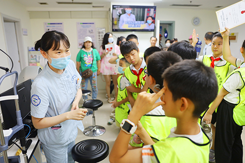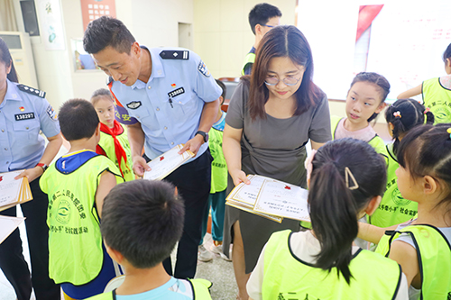 随后,参与活动的领导与嘉宾为参加本次“大手牵小手”暑期社会实践活动的同学们颁发证书并合影留念。讲座环节结束后,市二院的青年志愿者及学生志愿者们带领大家一起走进医院院区,直观感受眼科检查与骑警互动体验,让学生们对医疗及公安职业有全新的认识。