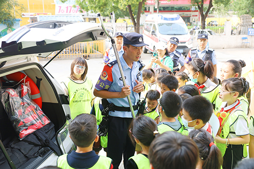 “做梦我都想骑一骑这帅气的警用摩托!”本次活动给八岁的男孩明明圆了一直以来的骑警梦。2号街面警务站站长吴超首先给孩子们介绍了出警车、警用摩托、盾牌、钢叉、催泪瓦斯、手铐的具体用途和基本使用方式,“铁骑”还进行了现场骑行展示,引来了现场学生们的阵阵叫好声。