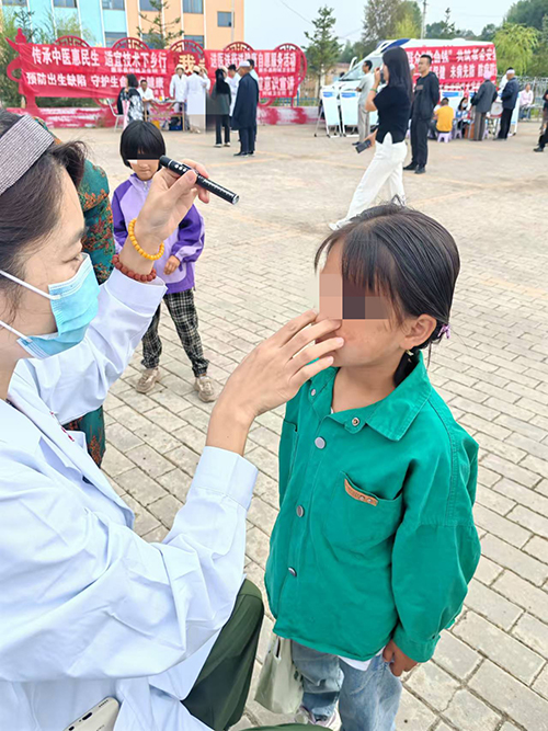 徐东艳医师在对口援助的甘肃临夏康乐县人民医院参加了“共铸中国心·脑心同治走基层”义诊公益活动,随医疗团队来到高林湾村委会为当地群众进行眼科义诊,让村民在家门口就能享受到高水平、高质量的眼科医疗服务。