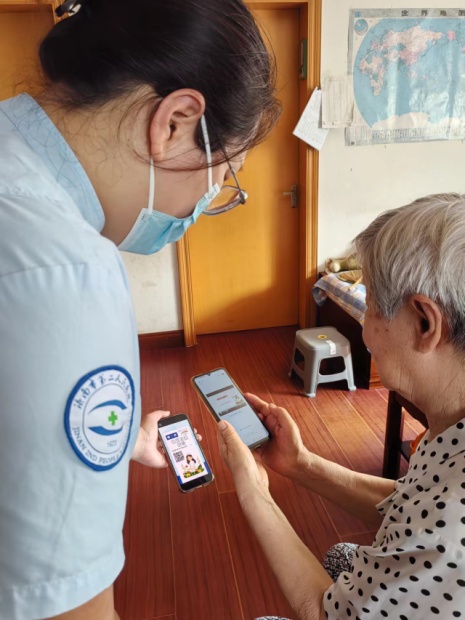 护理人员,在接到预约平台服务单,为行动不方便的居家老人提供上门服务,获得好评。