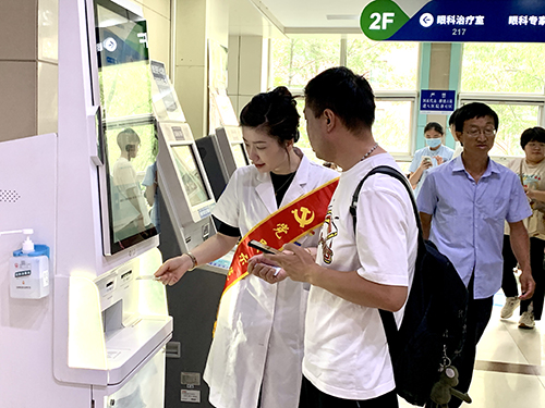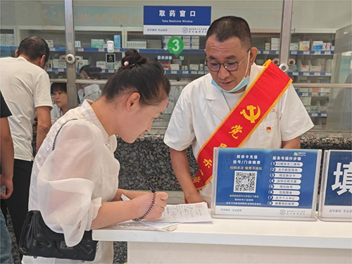 行政党支部以“践行宗旨意识,用心服务群众”为主题,开展“党员示范岗”第九季活动,组织党员志愿者为就诊群众送上关爱。