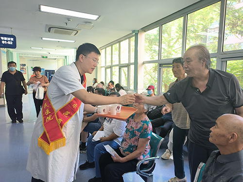活动期间,党员志愿者们每天一早身着绶带,每日轮流到门诊区域开展志愿服务,免费为就诊群众送上一杯绿豆汤,并协助导医开展秩序维护、办卡充值、指导就医、答疑释惑、就诊引导、科普宣教等工作,极大缓解了门诊医护者的工作压力,得到了患者和医护人员的一致好评。