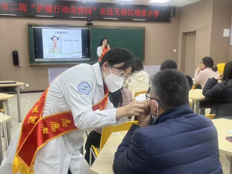 妇委会组织“护瞳行动”志愿服务队走进济南市天桥区瑞景小学,为全校教师带去一场别开生面的眼健康知识培训。旨在通过专业指导和实践操作,提高教师群体对近视防控和眼健康的重视程度,帮助老师们掌握科学的眼保健方法,从而更好地呵护自己和学生的视力健康。