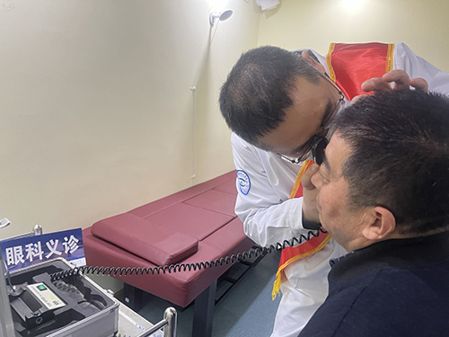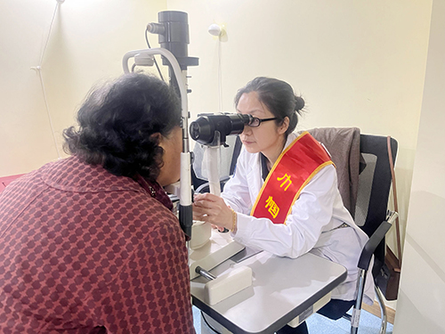 志愿者用裂隙灯为居民检查眼睛