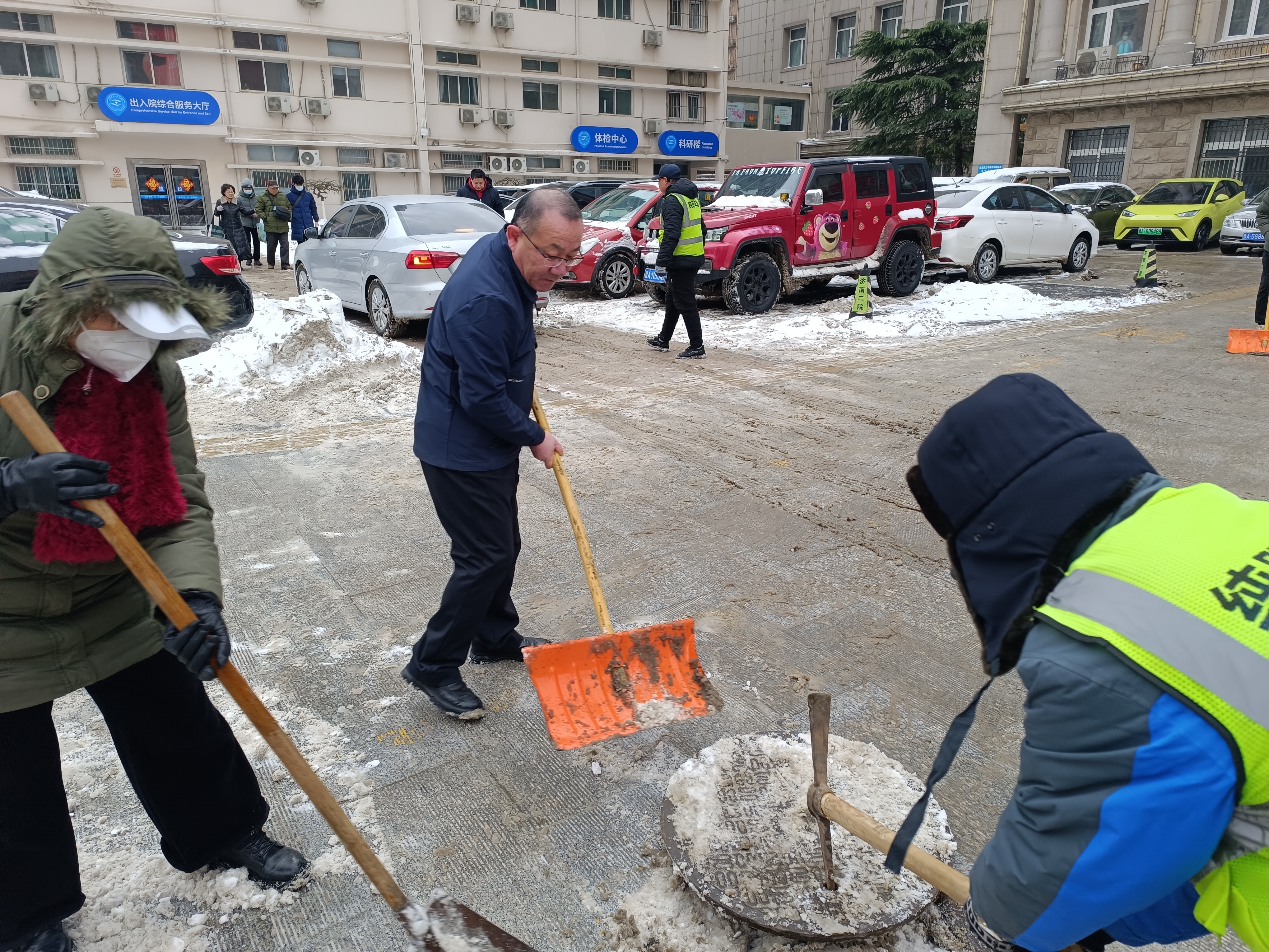 清扫现场,院领导带头,挥动铁锹、扫帚,与干部职工们一起清除院内积雪,对院区环境卫生进行整治。无论是医务人员、行政人员还是后勤员工,大家齐心协力,分工明确,共同投入到清扫积雪的行动中。