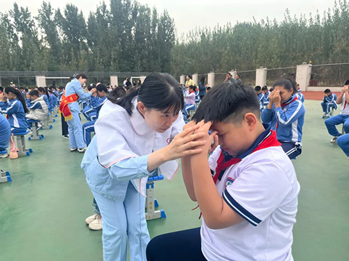 10月18日上午8时许,本次活动正式开始。退休返聘专家、眼科主任医师初宪华向现场师生介绍了目前我国儿童青少年近视的发展趋势,分享了近视形成和近视防控的相关知识及常见误区,并强调了建立屈光发育档案和坚持做眼保健操的重要性。随后,中医眼科宿艳主任从中医眼科学的角度简单介绍了眼保健操改善视疲劳和预防近视眼的基本原理,讲解了每节眼保健操的穴位位置及按揉手法。台下孩子们学习眼保健操的积极性被充分调动起来,在志愿者一对一地指导下认真学起了眼保健操。此外,为提升教师对学生开展眼保健操教学辅导的能力,志愿者还对班主任老师开展了眼保健操培训,通过现场示范和实际演练,帮助老师们快速地掌握了眼保健操的规范动作,确保眼保健操真正发挥应有的功效。