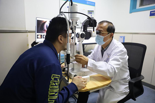 韩旭光主任用裂隙灯为患者检查眼睛
