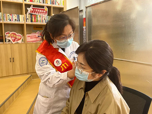 市二院中医眼科副主任医师陈丽丽为居民进行耳穴压豆
