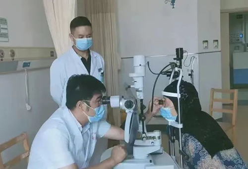 陶远主任用裂隙灯为患者检查眼睛