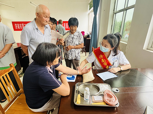 走进商河县杨八士村开展“青春心向党 携手共振乡”志愿服务义诊活动。此次活动派出了眼科、内科、中医科专业团队,共计服务群众近100人次,发放健康宣传资料100余份,为群众提供了面对面、零距离的医疗服务,得到当地村民的热烈欢迎。