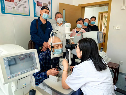 志愿者用裂隙灯为居民检查眼睛