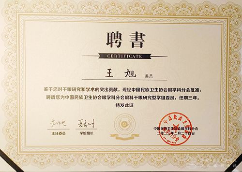 此次会议邀请了众多国内知名眼科专家,大会围绕眼表及干眼相关疾病、干眼诊疗新策略、新进展、新技术、新规范和新技能教育等内容,进行了深入交流,并同期举办了国家级干眼诊疗中心规范化培训班。王旭教授当选全国干眼研究型学组委员,并被聘为特聘讲师。