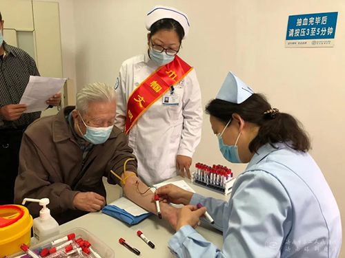 志愿者陪同老同志抽血化验