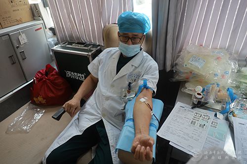 眼底病科张同河主任每年都参加献血活动,这次他刚刚做完手术就赶来献血,采血结束后来不及休息就马上赶回病房继续忙碌。