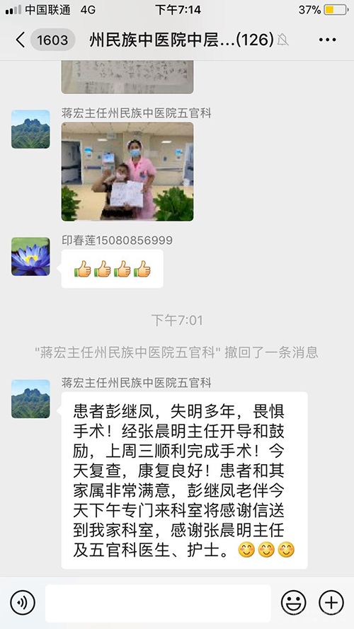 “患者彭继风,失明多年,畏惧手术!经张晨明主任开导和鼓励,上周三顺利完成手术!今天复查,康复良好!患者及家属非常满意,今天下午专门来科室送上感谢信。”这是湘西州民族中医院中层群中的一段对话内容,感谢信是这样写的“我老伴到贵院眼睛开刀,你们邀请的外地专家医术高明,出院后从生活起居,到饮食及吃药的细节等都详细说明交待,技术高超、服务态度好说明对湘西人民有责任感啊!”一封手写的感谢信,饱含着患者的认可和感激。