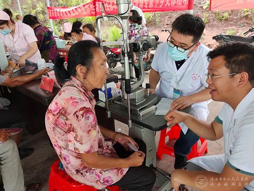 7月29日,湘西州古丈县中寨村进行“关心百姓健康”义诊活动。上午9时,中寨村村部比平时热闹许多。专家们下车后立即投入紧张的工作中,量血压、测血糖、测视力、眼底检查、白内障筛查、详细询问病史,耐心对患者诊疗。此次义诊活动,张主任共为200余人进行眼科检查。