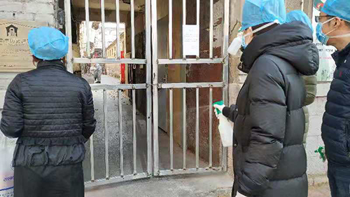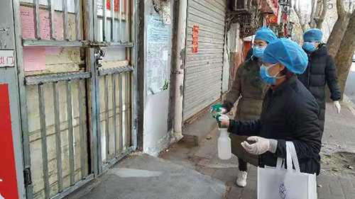 2月13日上午,4名来自医院行政党支部的党员志愿者在社区工作人员的带领下,对经二纬六路沿街进行巡查,重点对经一纬五路至经二纬五路路东楼院、纬五路的16个楼院的大门、门锁及把手进行了集中喷洒消毒,最大程度减少疫情在公共区域传播。