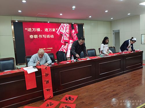 活动在医院门诊病房楼七楼会议室举行,邀请了职工中书法爱好者作为主角,他们挥毫泼墨,把新春的祝福和美好的期盼,书写在火红的春联里。