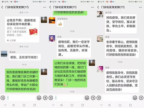 “现在是疫情发展的关键时刻,我们是门诊工作第一线,要做好党员先锋模范带头作用,带动广大群众打好疫情防控的攻坚战!”“疫情当前,我们一定坚守岗位,起模范带头作用。如有需,无条件,听调遣。”“让我们众志成城,把好疫情防控的第一线,我们门诊社区党员同志们继续努力做好本职工作,把防线做坚实!门诊一线的同志们加油”在门诊社区党支部的工作群中,党员医护人员满满的正能量深深地感染着大家。