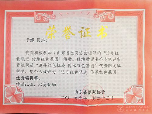 12月28日,山东省医院协会“追寻红色轨迹 传承红色基因”总结大会和协会医院报刊暨新媒体专业委员会2019年年会在济南举办。会议表彰了“追寻红色轨迹 传承红色基因”活动的相关奖项,济南市二院荣获优秀图文编辑奖,于娜荣获优秀编辑奖。