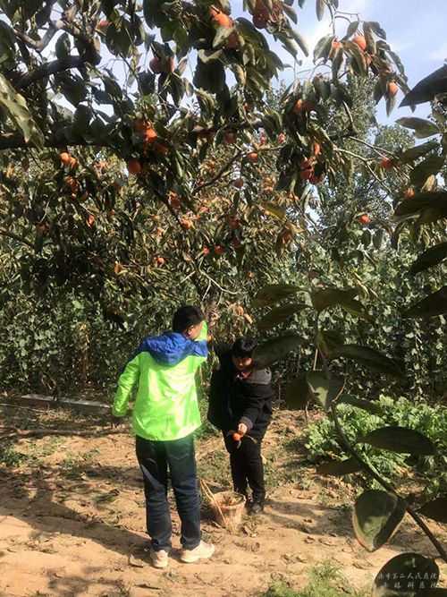 随后崔主任带领大家来到大赵村的12号柿子基地,帮助当地村民采摘丰收的柿子。一下车,映入大家眼帘的是一片片满树珠珠串串挂枝头的柿子,橘黄色的柿子像一盏盏小灯笼挂在深秋的田野里,格外引人。大家抑制不住兴奋,不顾旅途劳累,3-5人一组,有的爬上柿树采摘高处的果子,有的站在梯子上采摘中部的果子,有的伸手采摘底处的果实,忙得不亦乐乎,不一会一大堆柿子像小山一样堆在地头。村民们高兴合不拢嘴,连连道谢。