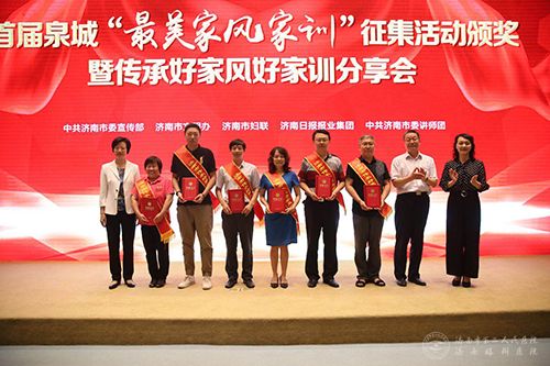 4月19日上午,由中共济南市委宣传部、济南市文明办、济南市妇联、济南日报报业集团、中共济南市委讲师团联合主办的寻找家庭“幸福密码”首届泉城“最美家风家训”颁奖仪式在济南市龙奥大厦举办。市二院刘伟家庭作为市卫健委妇委会推荐家庭,在首届“泉城最美家风家训”征集活动中,被评为乐业进取篇 “最美家风家训”。