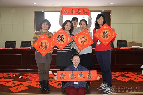 活动在医院门诊病房楼七楼会议室举行,邀请了职工中书法爱好者作为主角。他们挥毫泼墨,把对职工群众的祝福和对幸福的期盼,书写在火红的春联里。随后,院工会为临床一线科室登门送上福字和春联。活动的开展凝聚了正能量,为广大职工群众送上了一份特别的“文化大餐”。(工会 郭兆瑞)