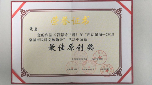 由济南市卫计委妇委会推荐,济南市二院职工王俊峰、于娜创作,徐勇、党惠参加展演的《若瑟诗三则》,在近日市委宣传部、济南广播电视台、市教育局、团市委、市妇联联合主办,济南人民广播电台承办的品牌文化活动“声动泉城——2018泉城市民诗文咏诵会”活动中荣获“最佳原创奖”,该奖项也是市卫计系统唯一的一项单项奖。