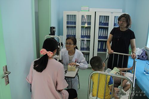 早上八点,市二院四名医护人员来到济南市儿童福利院,一张张稚气的小脸印入眼帘,孩子们不同程度的先天性眼疾让人顿生怜爱之情。两名评残专家王建荣主任和韩方菊主任马上投入到紧张的工作中,一边检查一边仔细记录着孩子的病情,遇到情况特殊的孩子,市二院的评残专家还不忘停下来多嘱咐福利院的工作人员几句。有一名叫青青的1岁弃婴患有先天性青光眼,检查到她时,韩方菊主任把她揽到自己怀中,对孩子的“妈妈”(福利院工作人员)说:“平时多注意孩子的情况,哭闹的时候多照顾照顾,因为这个病是会给孩子带来痛苦的,辛苦你了。”还有一个四岁的小男孩,工作人员说总是爱用手揉眼睛,王建荣主任刚要检查,福利院的工作人员提醒说孩子患有乙肝,但王主任丝毫没有犹豫,继续按照标准检查着孩子的病情,直到检查完毕才清洗了手部,继续为其他孩子检查。福利院里的孩子一般并不是患有单一的疾病,而是多种病症集一身,他们普遍十分抗拒与陌生人有肢体接触,这给评残工作带来了一定难度。但市二院的专家们不顾高温天气和孩子们的不配合,十分耐心认真地为孩子们进行检查,孩子们好像也感受到了她们的关爱,都十分的配合。