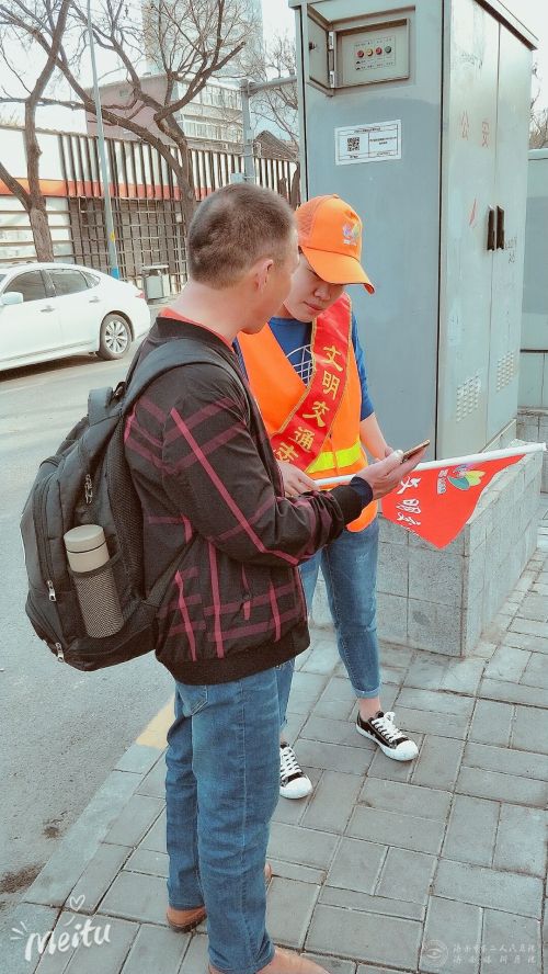 的4名志愿者来到经四纬六十字路口,身着红色马甲,手持文明劝导旗,站在路口为来往行人提供各种志愿服务。他们在红绿灯路口处提示出行市民遵守交通规则,对随意横穿马路、跨越道路隔离设施、闯红灯、逆向行驶等不文明行为进行劝导。