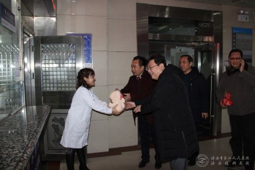 2月16日农历大年初一,济南市卫生和计划生育委员会党委委员、副主任侯廷成一行到黑料网 ,看望慰问坚守岗位的医护人员,督导节日期间的医疗安全工作。院党委书记牟鑫,纪委书记、副院长程晓麟,副院长张毅、部分职能科室主任参与慰问活动。