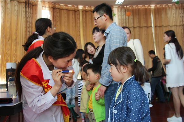 服务队志愿者为小朋友做视力检查