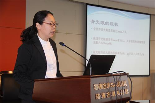 眼博士大课堂—青光眼专题讲座于下午2:00准时开讲,80多名青光眼患者早早来到医院,认真聆听眼科专家的知识讲座,很多患者都是有备而来,边听边做笔记。主讲医生市二院眼科副主任医师宋爱萍从青光眼的发病症状、分类、诊断治疗、手术方式等几个方面为患者进行了通俗易懂的讲解,并在互动环节中对病人提出的疑问进行了详细的解答。据宋主任介绍,青光眼是导致人类失明的三大致盲眼病之一,如不及时治疗,视力可以全部丧失而至失明。所以一定要重视对青光眼的预防,如果大家能正确了解青光眼的眼病病因、症状、及预防保养等知识,就可以做到早筛查,早发现,早治疗,从而最大限度地保护其有用的视力和视野,减少视功能的损伤,提高生活质量。