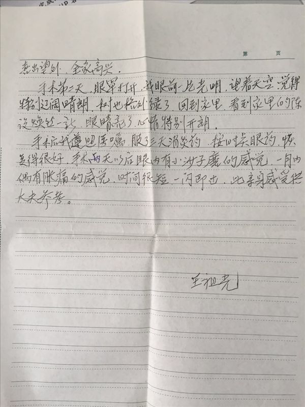 手术第二天,眼罩打开,我眼前一片光明。望着天空,觉得特别辽阔晴朗,树也格外绿了。回到家里,看到家里的陈设焕然一新,眼睛亮了,心情特别开朗。