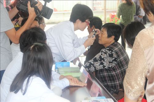 眼科医师用简易设备为群众检查眼睛