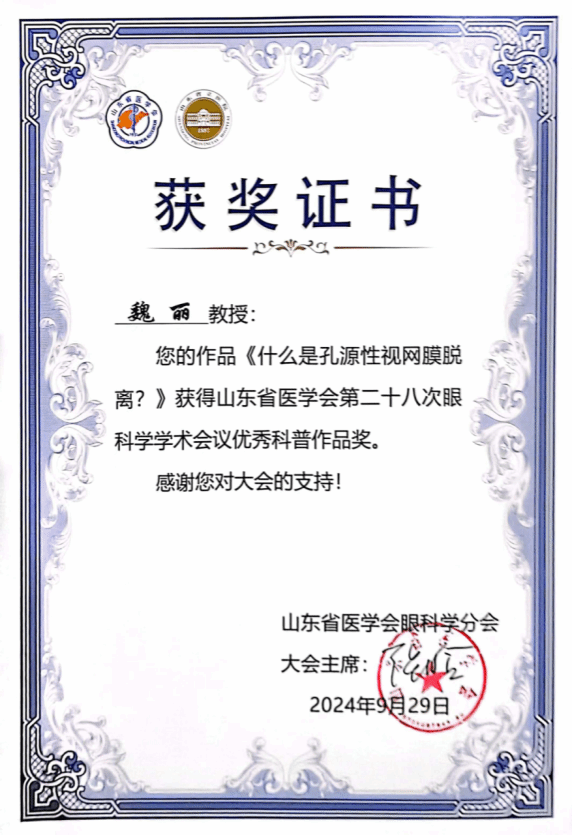 在由山东省卫生健康委、科技厅、疾控局等部门联合主办的山东省新时代健康科普作品征集大赛中,市眼科医院(市二院)报送作品获得二等奖1项,三等奖1项。郭兆瑞、张亚丽、冯一婧的作品《如何摘镜,专家、主持人为您联手“画”重点》荣获视频类二等奖,干眼门诊李莹、赵欣、高聪聪的作品《关于干眼那些事》荣获视频类三等奖,据悉本次大赛收到视频类作品2948件。此外,刚刚结束的山东省医学会第28次眼科学学术会议上,眼科医师魏丽科普视频作品《什么是孔源性视网膜脱离?》在98件科普作品中脱颖而出,获评优秀奖。