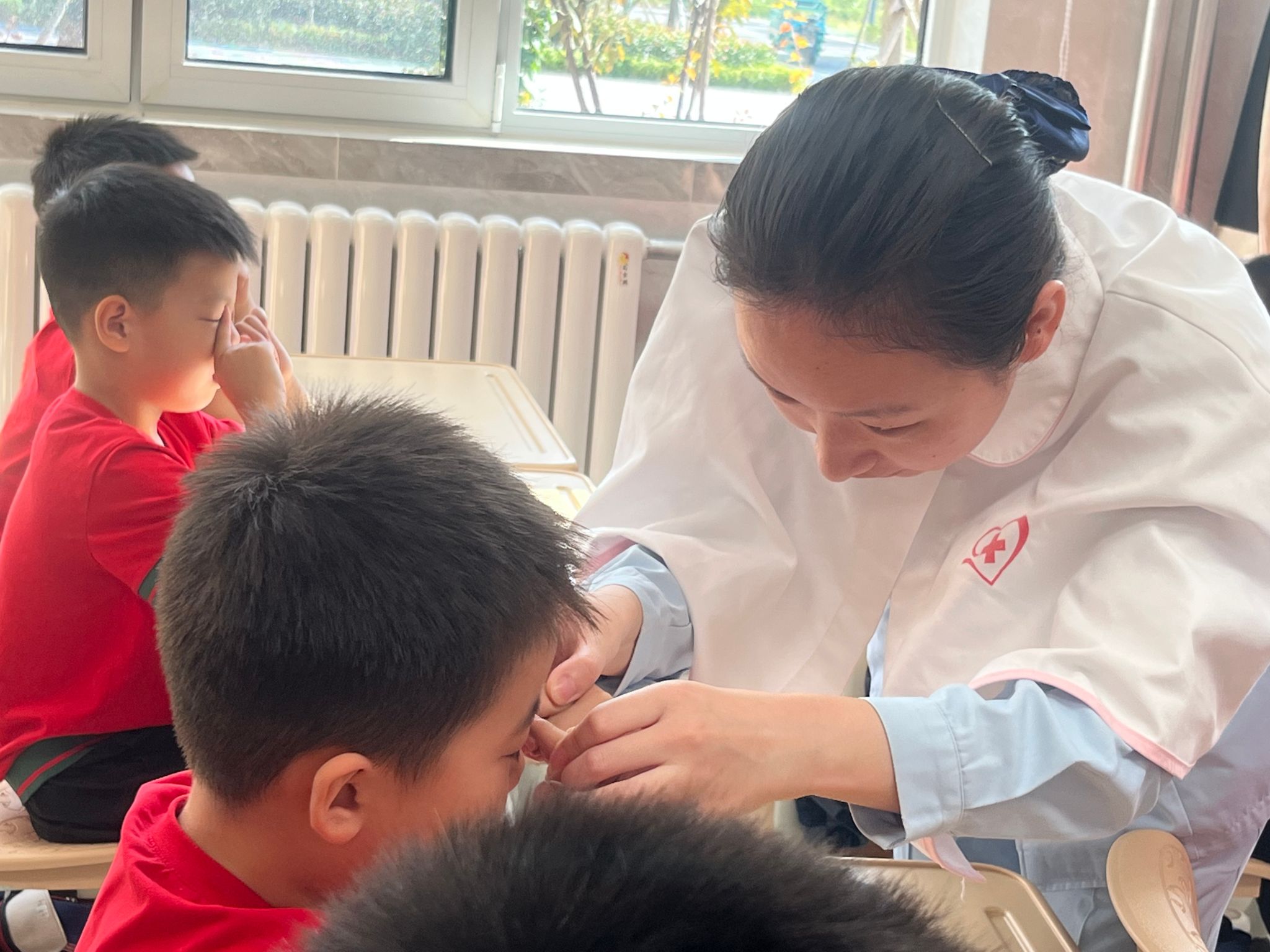 志愿者为孩子调整眼保健操动作