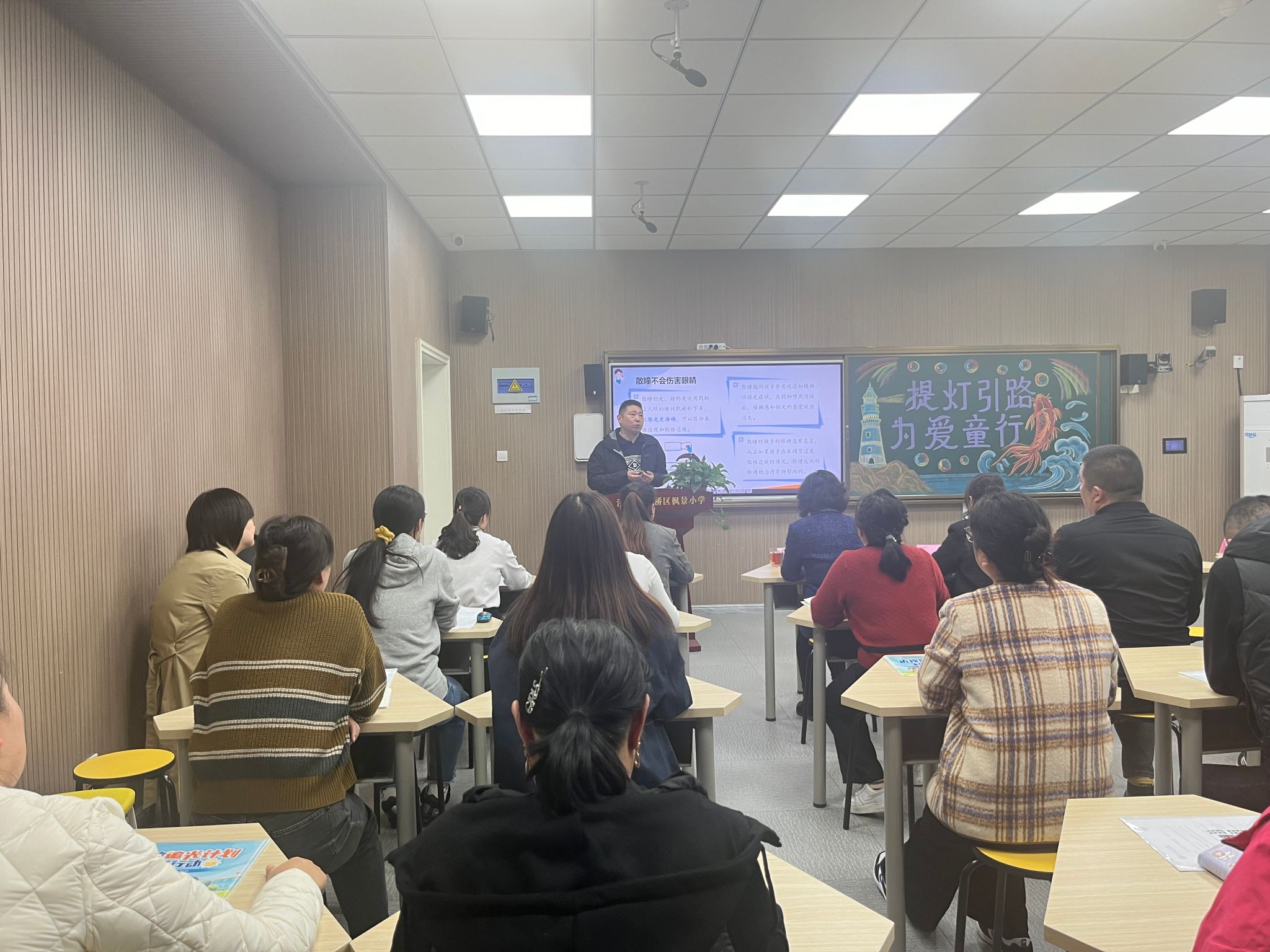 培训中,专家们为学生家长解读了上学期近视筛查报告的相关结果,讲解了儿童青少年近视防控的最新研究进展,分享了家庭近视防控的实用技巧和注意事项。同时向他们强调了家庭环境布置、饮食习惯调整以及电子产品使用管理等方面的重要性,引导家长们树立正确的近视防控观念,与学校形成合力,共同守护孩子们的视力健康。除专题培训外,“护瞳团队”向全市家长发出一封信,温馨提醒家长关注孩子视力健康,呼吁为孩子在家中营造一个健康的视觉环境。此外,“护瞳团队”的专家们还特别针对班主任群体开展了专业培训。团队结合学校实际情况,为班主任们提供了切实可行的近视防控建议和措施,帮助他们更好地指导学生们进行眼保健操和日常用眼管理。与此同时,“护瞳团队”还建立了近视防控工作交流平台,方便校医们随时交流和分享经验,携手推动学校近视防控工作的深入开展。