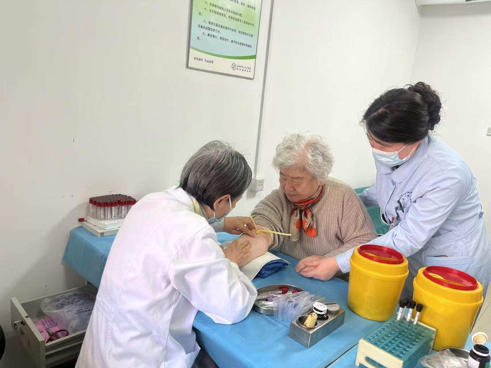 医务人员为老同志抽血化验