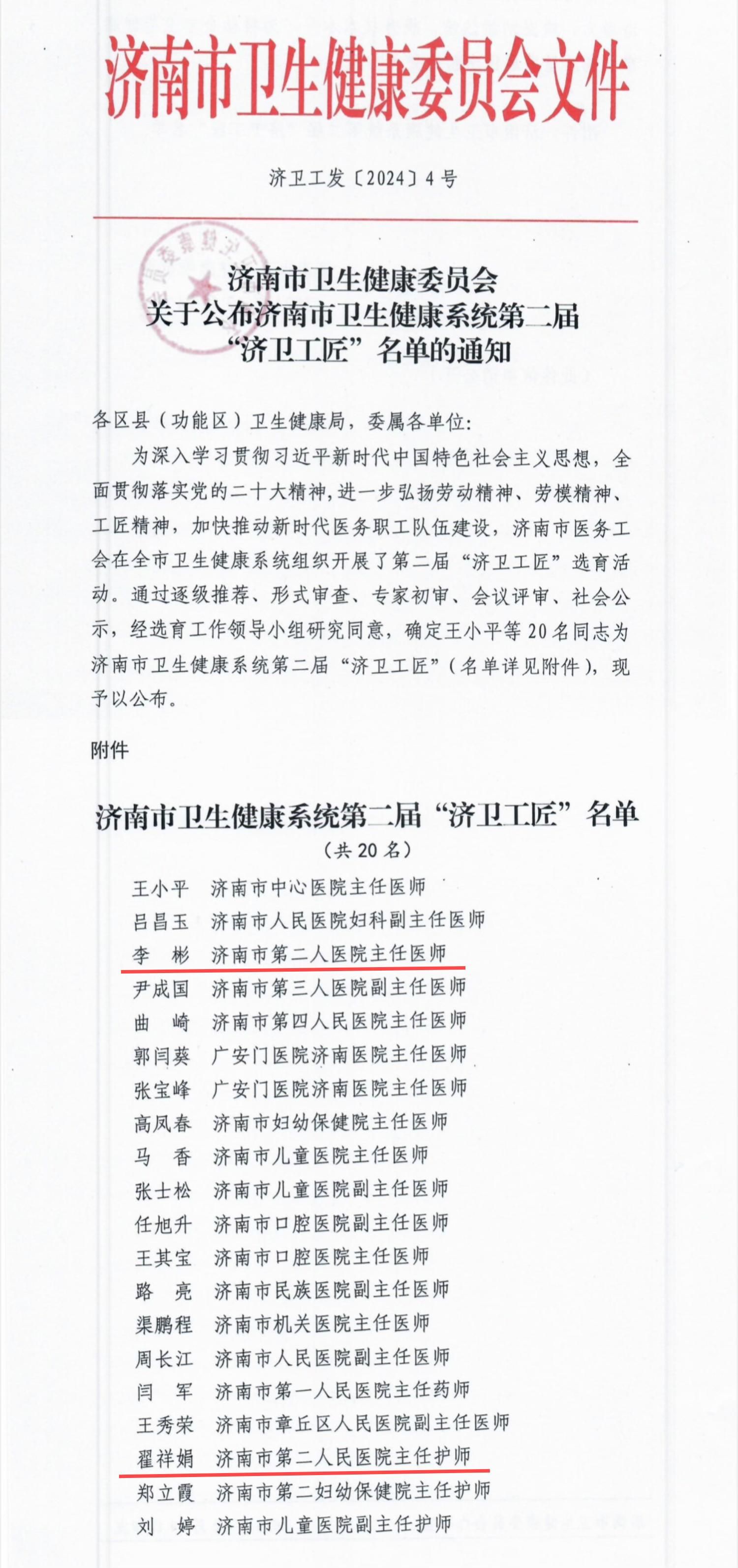 )职工李彬、翟祥娟获评市卫健系统第二届“济卫工匠”。