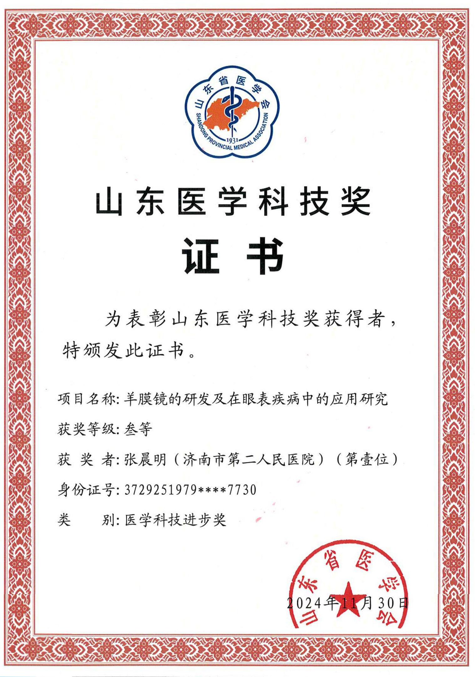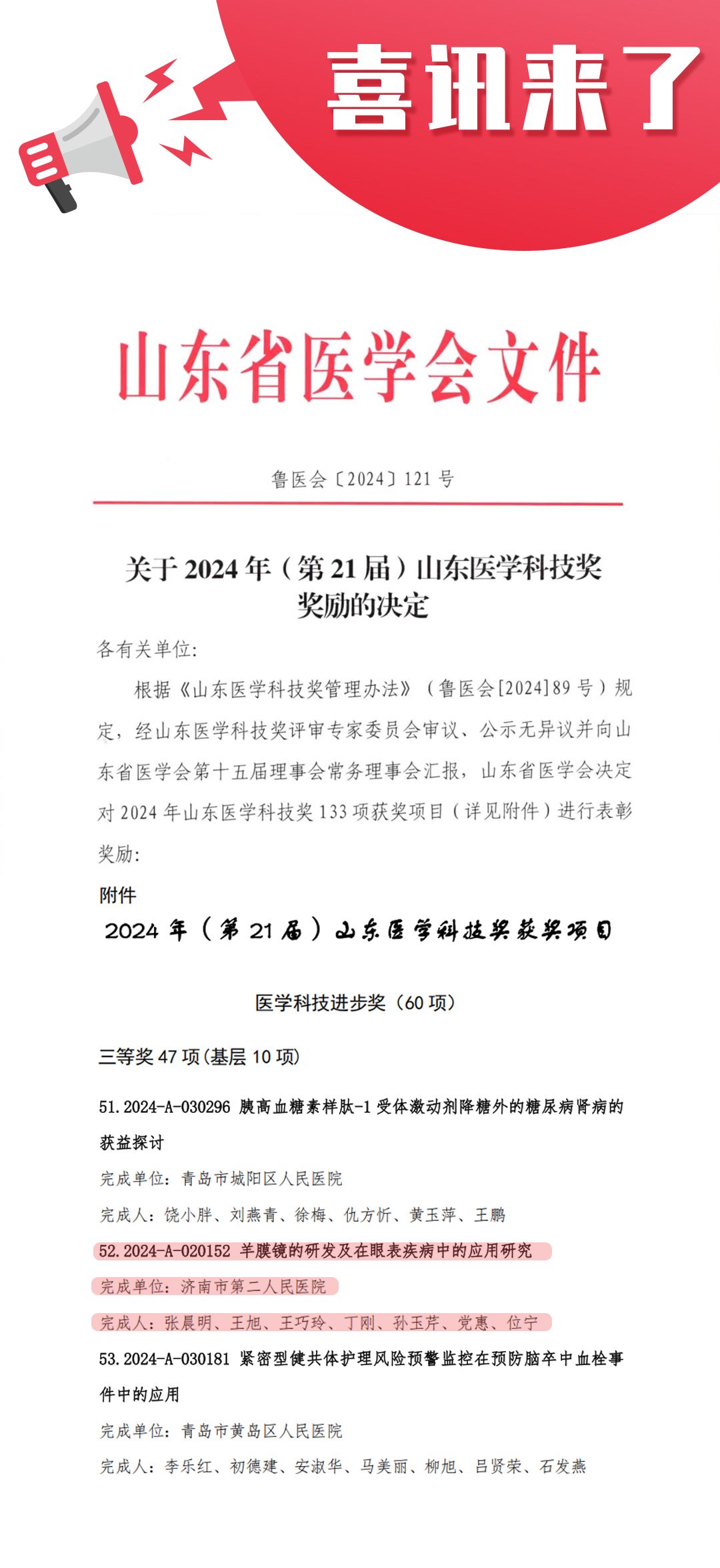 )科研团队主研的科研项目《羊膜镜的研发及在眼表疾病中的应用研究》收到山东医学科技进步奖三等奖证书。这一荣誉不仅是对科研团队辛勤付出与卓越创新的肯定,也是市眼科医院(市二院)在眼科研究领域取得的又一重要里程碑。