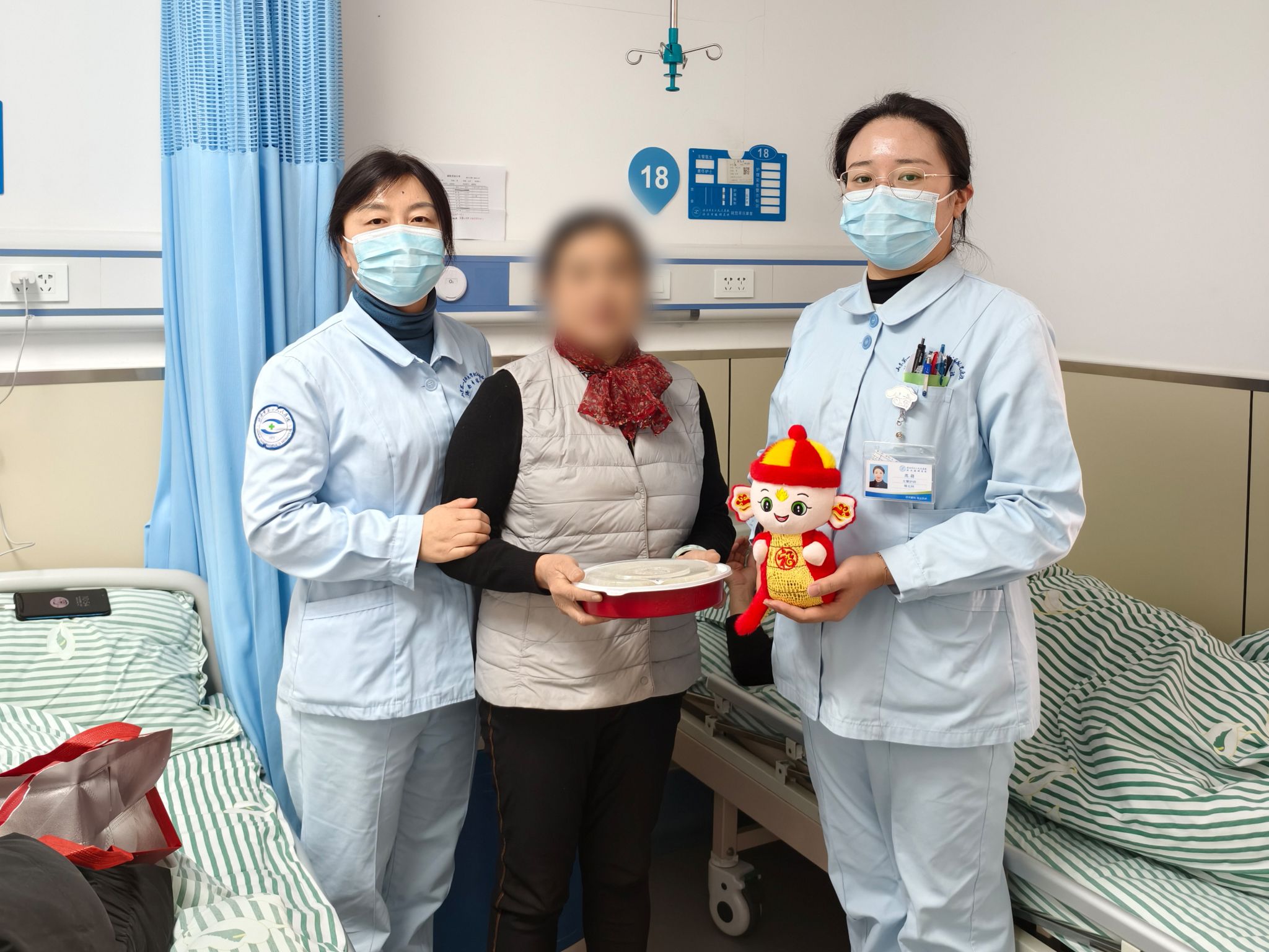 年夜饭上,护士长王娟和值班医务人员将蛇年福宝宝和热腾腾的饺子送到患者的手中,并跟患者聊聊天,唠唠家常,祝他们早日康复。病房里到处洋溢温馨暖暖的医患情深,也缓解了患者不能在家过年的愁绪。“太感动了,原本以为只能在医院冷冷清清度过这个蛇年春节,没想到在这个特殊的节日里收到新年礼物和祝福,还能吃上热气腾腾的饺子,让我们感受到了家一样的温暖和真情!这是一个让人无法忘记的特殊春节!”患者及家属们们纷纷表示,感谢医护人员的关心和付出,让他们在病房里也能度过一个温暖愉快的春节。