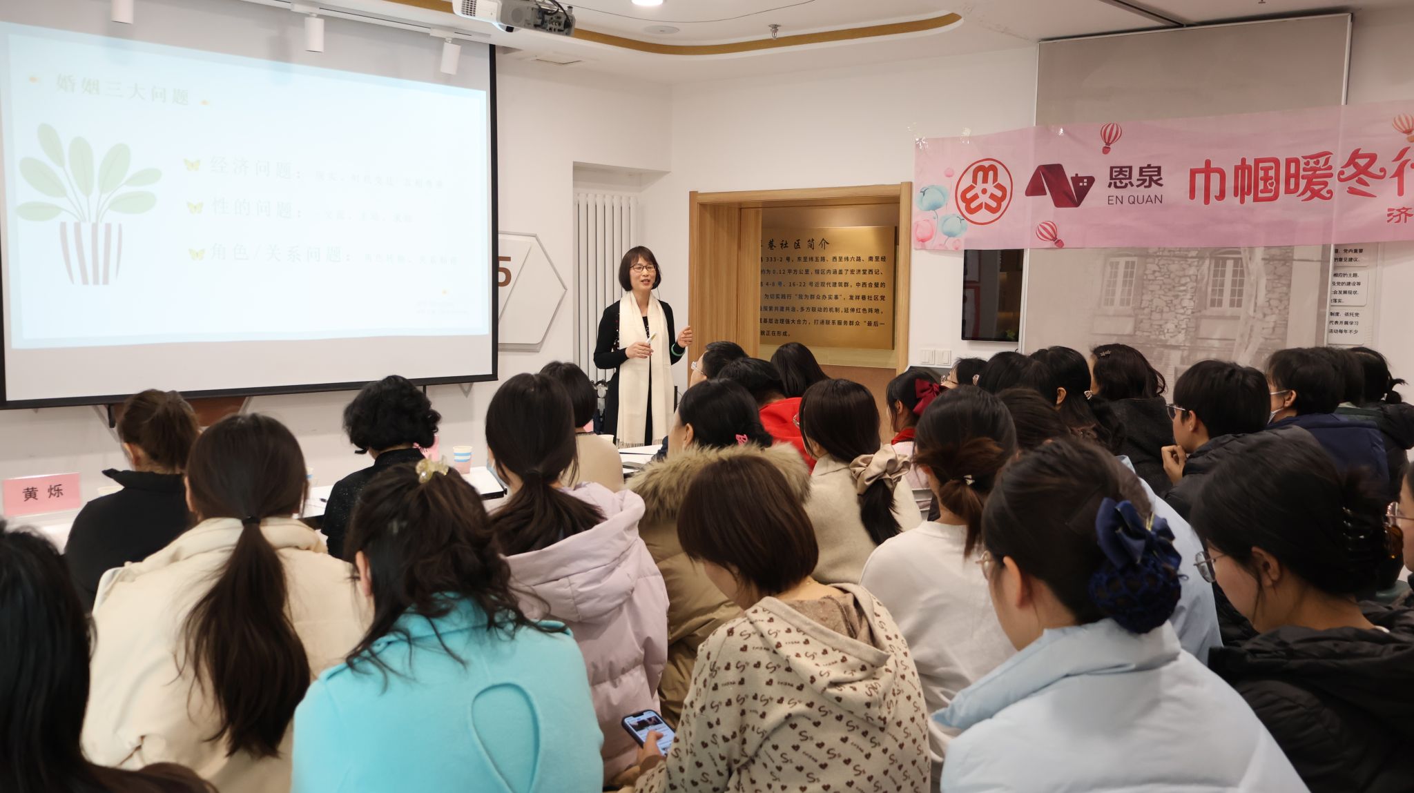 )共同承办,五里沟街道发祥巷社区协办,济南市恩泉社会工作服务中心执行的巾帼暖冬行动—“有爱有家与你同在,解锁家庭幸福密码”沙龙活动在槐荫区五里沟街道老商埠·暖新之家举办。活动的开展旨在通过专业讲座和互动游戏,帮助职工增进家庭情感交流,探索家庭幸福的秘诀。