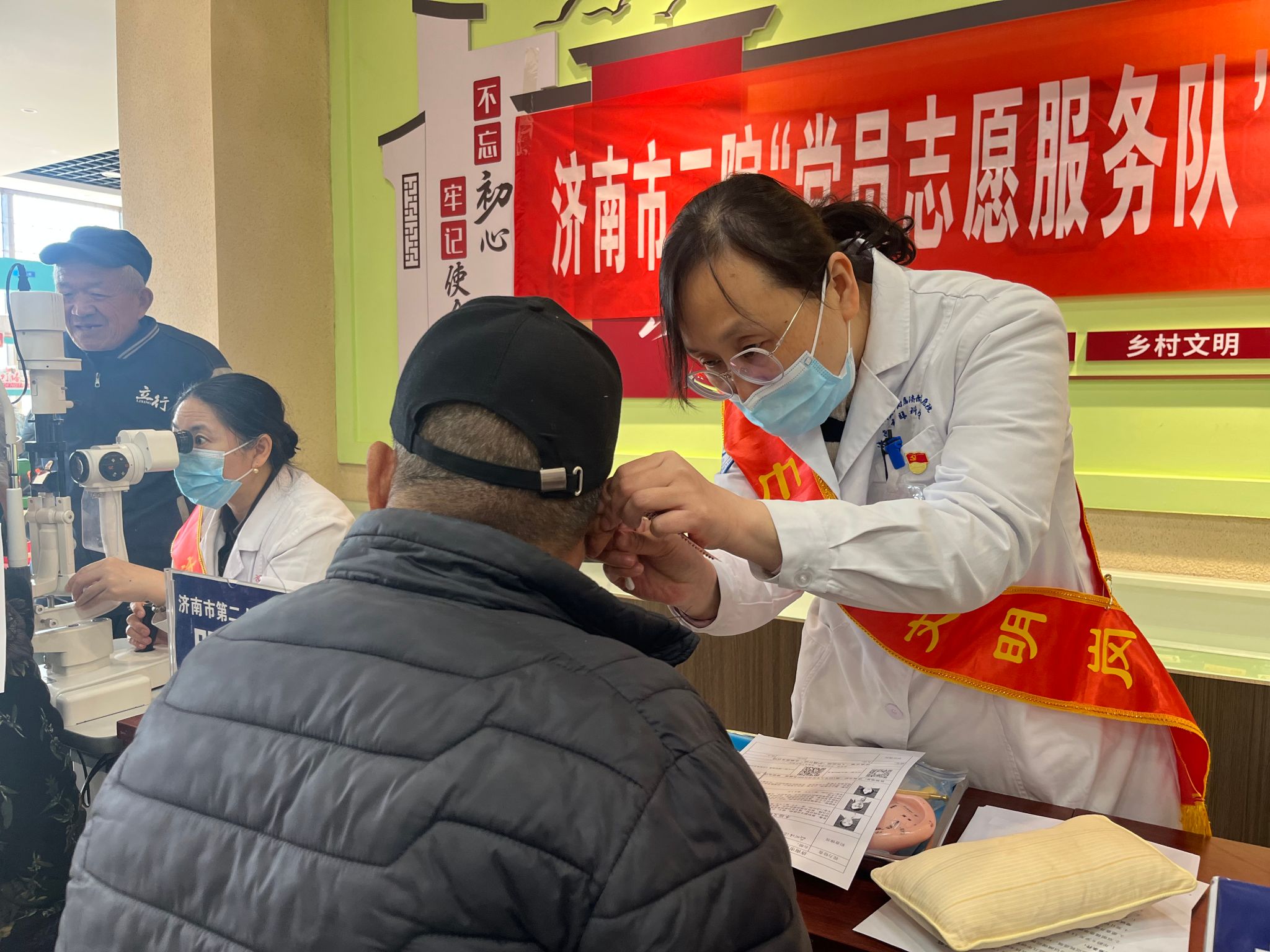 志愿者为村民进行耳穴压豆
