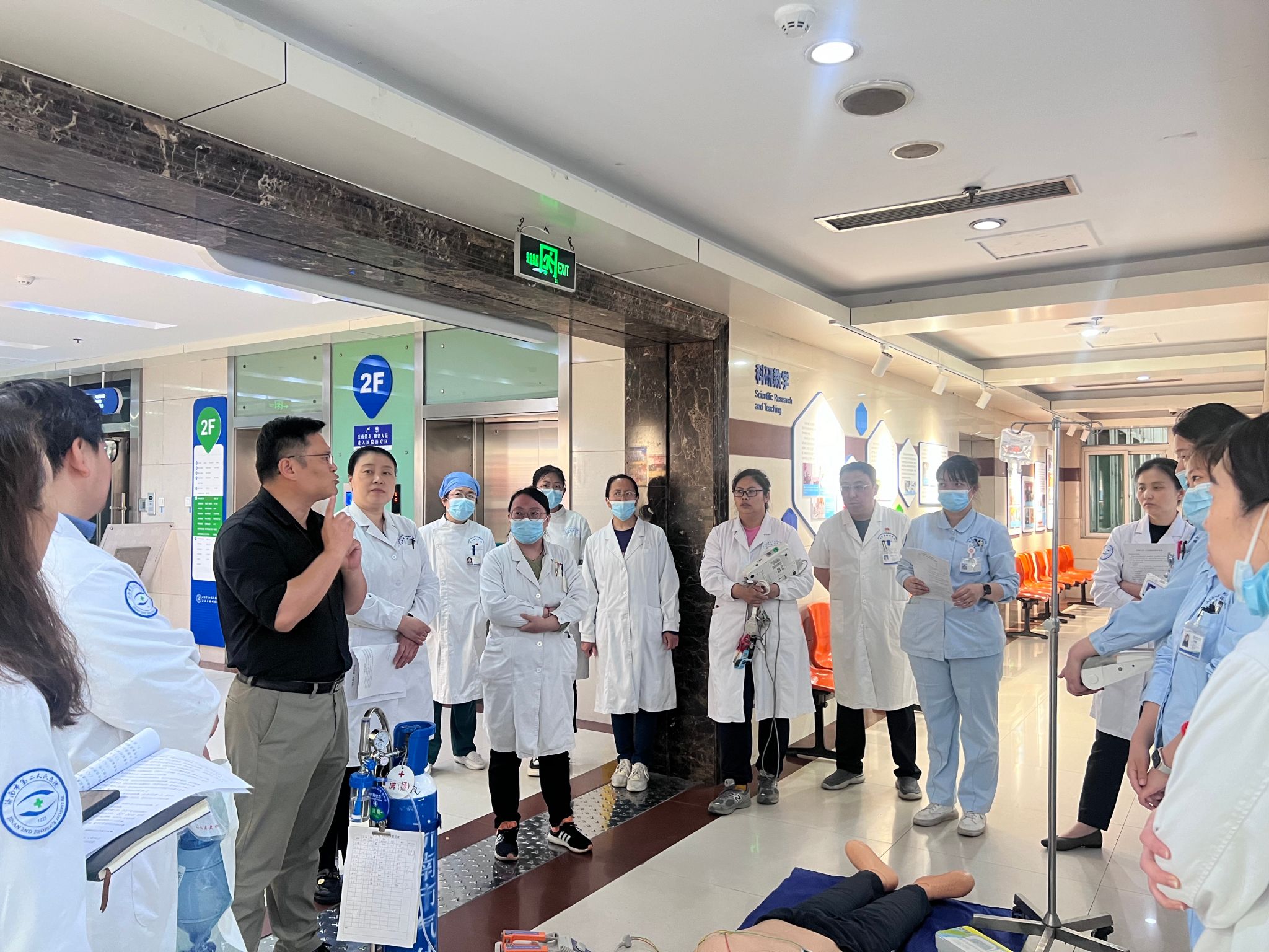 )门诊部联合医务科、护理部等部门,组织多科室协同配合,在眼科门诊开展了门诊急危重症患者(心脏骤停紧急救治)应急演练。