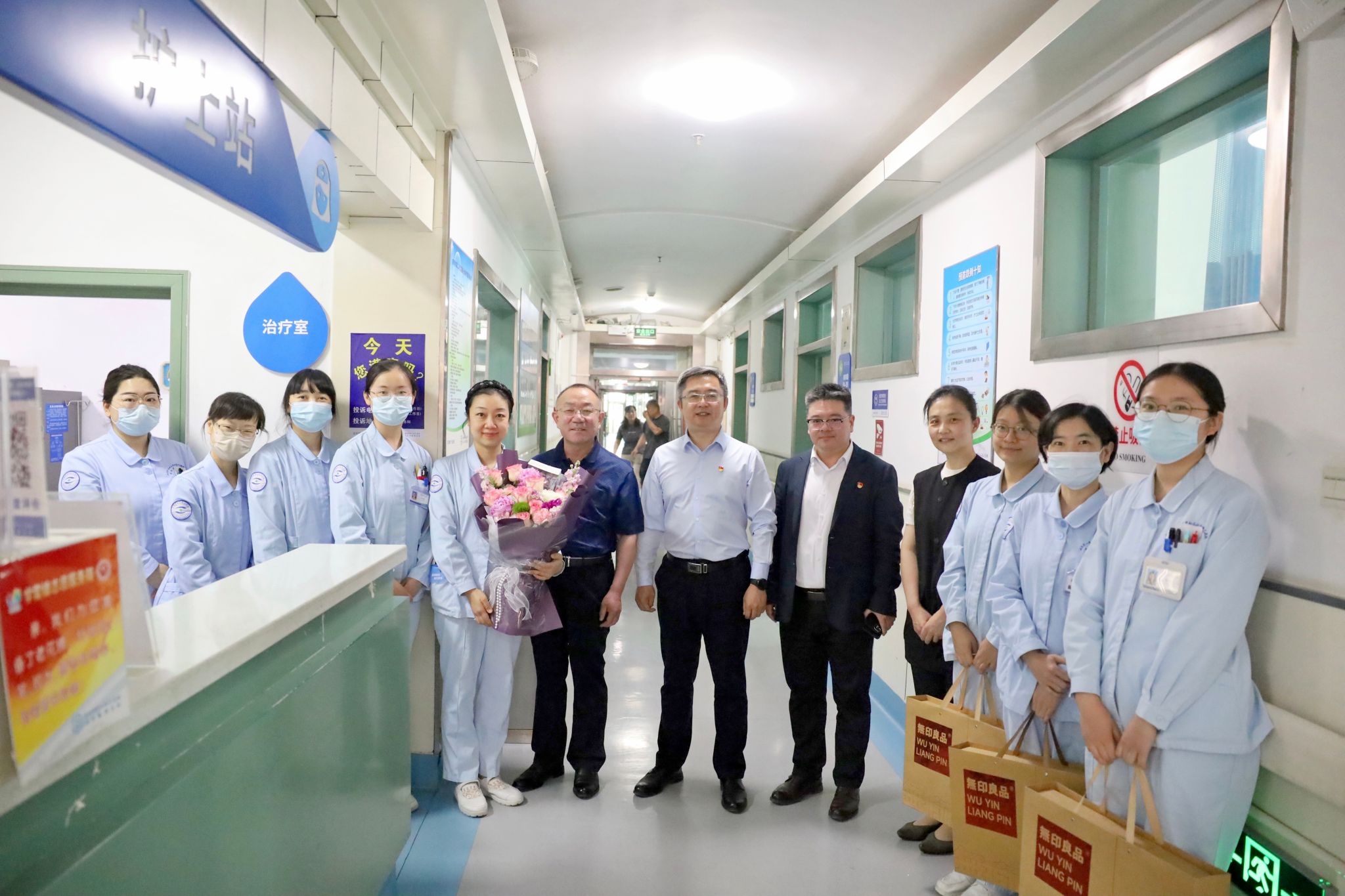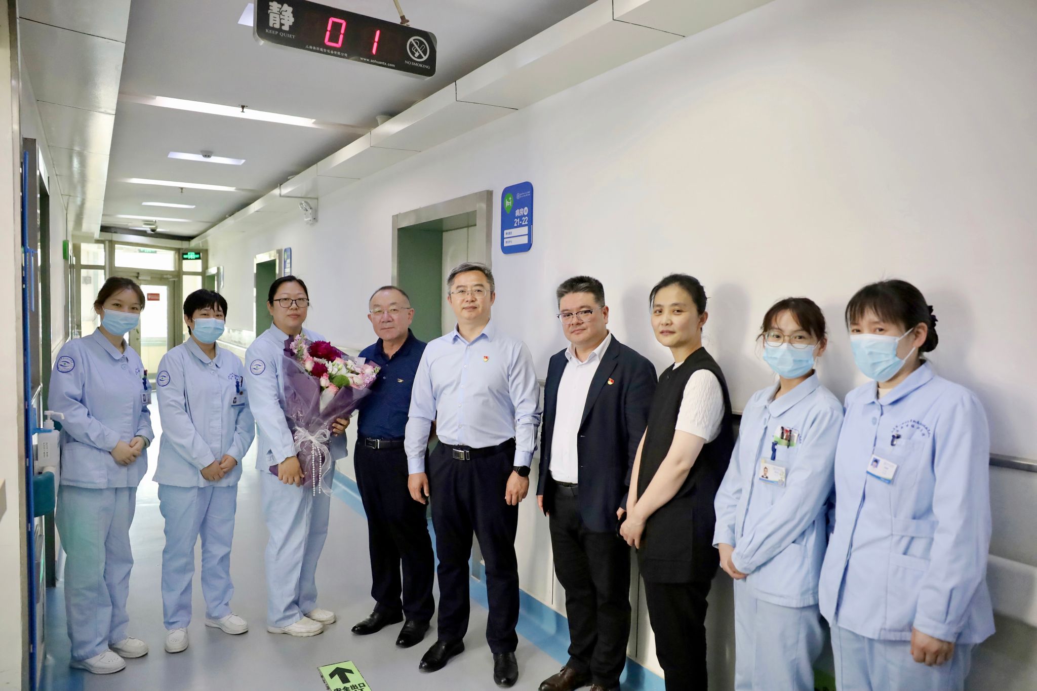 )党委书记东光国、院长刘军、党委委员张晨明及相关职能科室主任走进临床一线,为奋战在一线的护理人员送上鲜花和暖心关怀,为她们送去节日的问候与诚挚的祝福。
