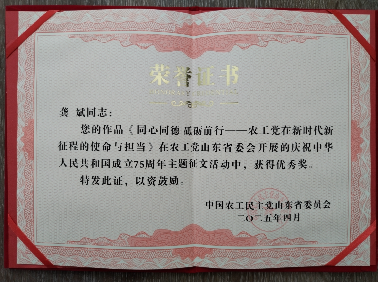 支部主任委员盛艳娟以《继承先烈遗志,做新时代合格的农工党人》为题,农工党党员龚斌以《同心同德 砥砺前行——农工党在新时代新征程的使命与担当》为题参与征文,分别荣获三等奖和优秀奖。深刻展现了农工党黑料网