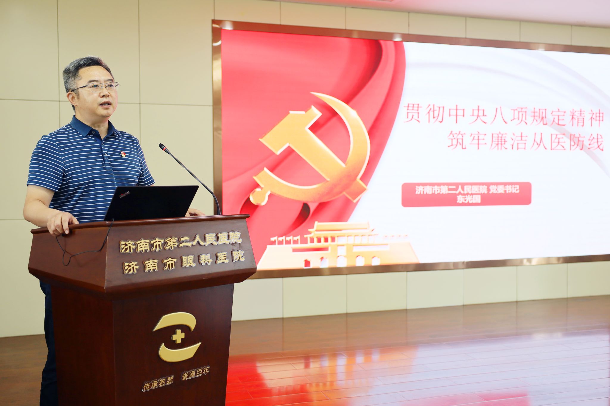 会上,党委书记东光国同志进行了题为《贯彻中央八项规定精神 筑牢廉洁行医防线》的党课宣讲。东书记在党课中深入阐述了中央八项规定精神的内涵和重要意义,结合医院工作实际,分析了在医疗服务、药品采购、医患关系等方面可能存在的廉洁风险点。他指出,廉洁行医是医院发展的基石,每一位党员干部都要以身作则,将八项规定精神贯彻到日常工作的每一个环节,切实为患者提供优质、廉洁的医疗服务。