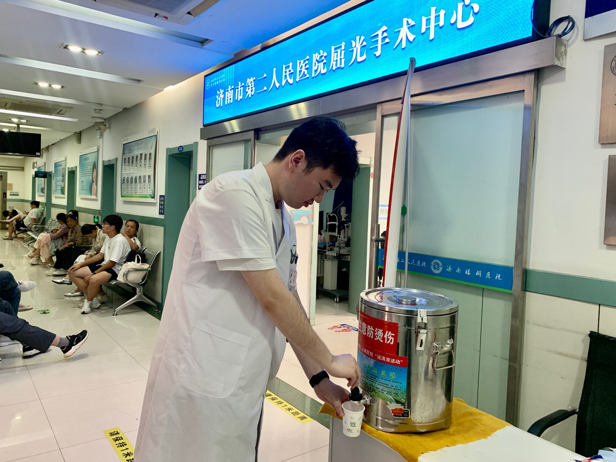 活动期间,医院工会每日定时在门诊二楼及屈光手术中心为职工供应现煮绿豆汤,还贴心配备了纸杯、纸巾,方便职工随时取用,每一杯绿豆汤都承载着工会对职工的贴心关怀。